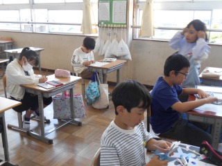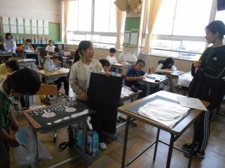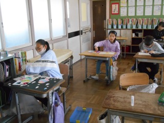 霧江を作っていました。マーブリングで染めて切り抜いた紙を黒い画用紙に貼り、作品を仕上げようとがんばっていました。