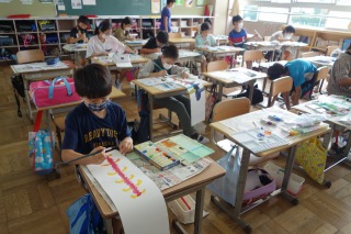 4年1組の図工は、作品展の絵を描きました。色を工夫して着色しました。