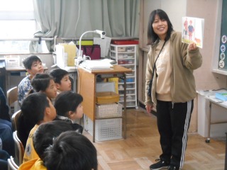 2年1組の担任の先生が読み聞かせをしていました。イラストのきれいな絵本を聞き、集中して聞いていました。