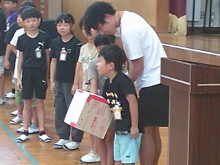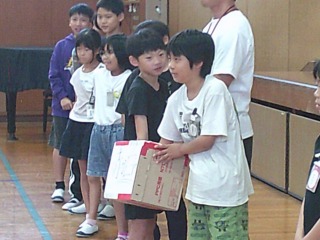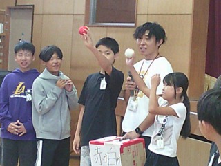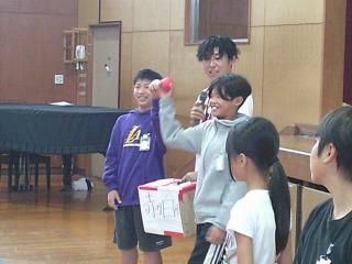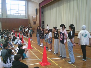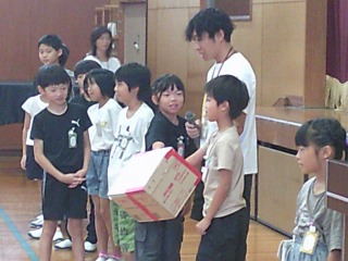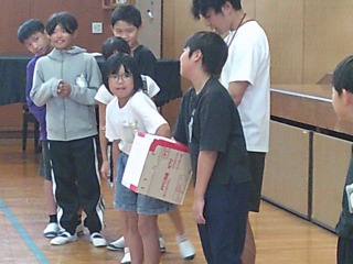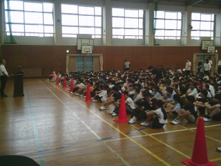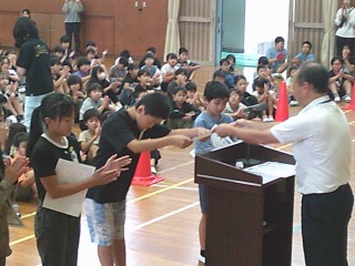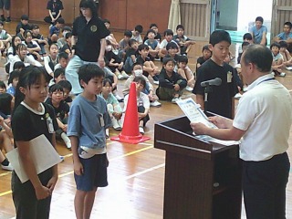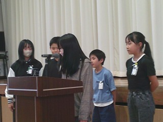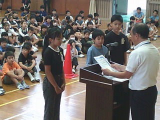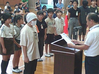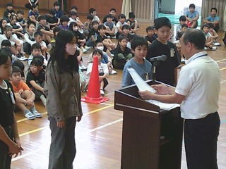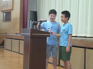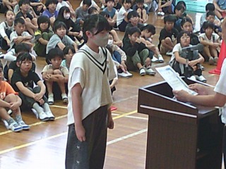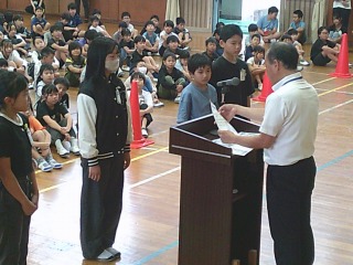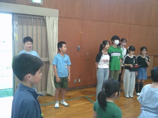 今日は火曜日ですが、後期開始の臨時朝礼を行いました。校長先生のお話から始まり、児童会執行委員と学級委員の認証を行いました。その後、生活委員会から今月の生活目標「協力してそうじをしよう」の呼びかけ、児童会からはミワリンピックのスローガンの発表とプログラム表紙絵募集の連絡がありました。最後に、ミワリンピックの赤白色分けのくじ引きを行いました。クラスの代表が前に出て引き、ボールの色を見ながら各クラスの児童が盛り上がっていました。