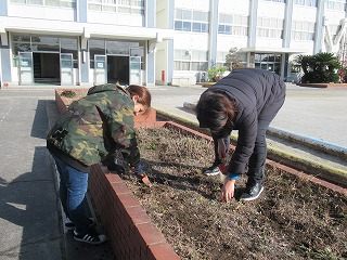 本日、校内除草(ビューティーフラワーズ)でプール前花壇の除草作業をしていただきました。花壇は冬になり枯れている植物が目立っていたのですが、すっきりきれいにしていただきました。レンガ花壇には、チューリップの球根も植えていただき、暖かくなって花を咲かすのが今から楽しみです。寒い中でしたが、本当にありがとうございました。