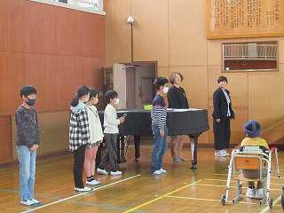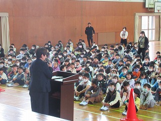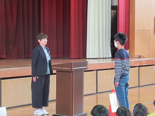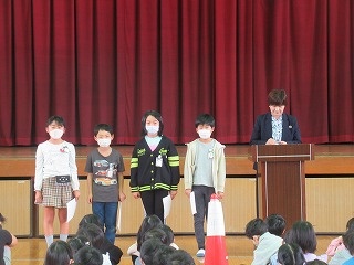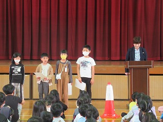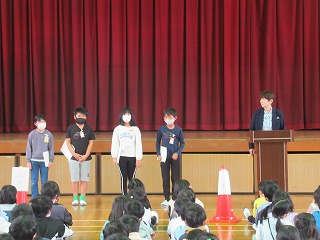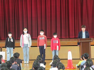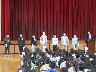 児童の前に立派に並ぶ委員長さんと学級委員さん。