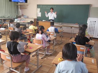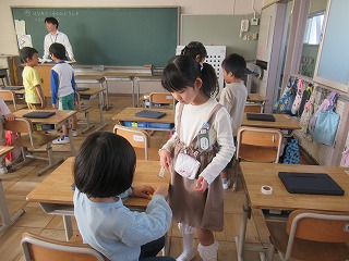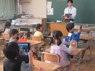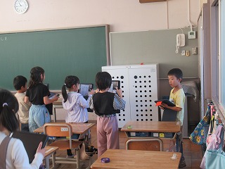 本日も教育実習生さんが、1年1組で算数の授業を行っていました。子どもたちは、笑顔でお話を聞いていました。また、今日は、タブレット端末を使い、測りたいものを写真に撮っていました。