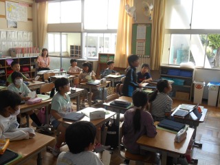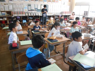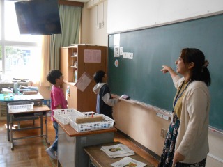 アルファベットのカードを、先生の発音した順に黒板に貼っていく活動をしていました。