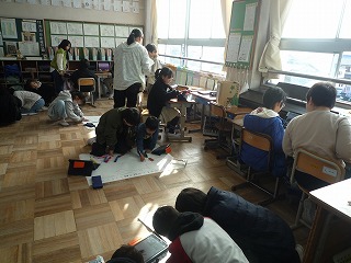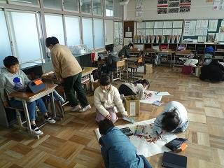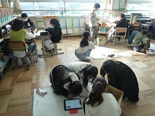 愛知県の観光スポットや港の歴史などをグループで協力して、模造紙にまとめています。
