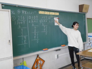 3けたわる1けたのひっ算を学習していました。順序を丁寧に確認しながら、解き方を覚えていました。