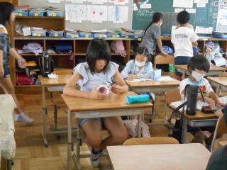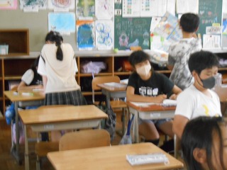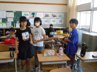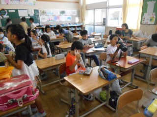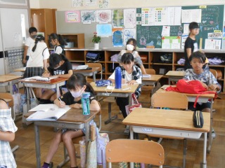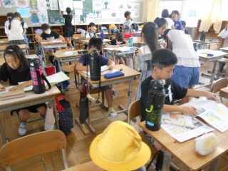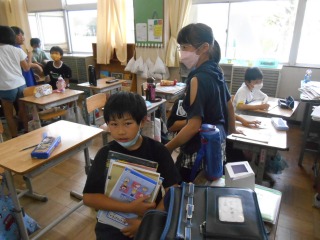 教室へ着いて給水している子、友だちとお話を楽しんでいる子もいました。