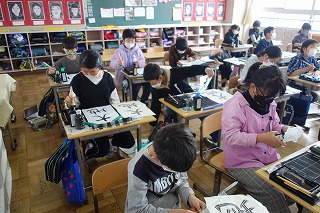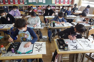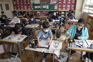 4年1組の書写は、毛筆で「大地」を書きました。今まで学んだ筆遣いのまとめをしました。