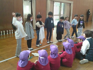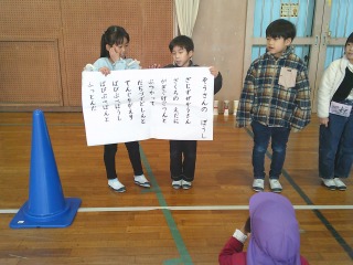 幼稚園の年長さんを招き、交流会を行いました。前半は小学校の生活について、8つのグループがそれぞれ違う内容を伝えていました。園児の皆さんは8つのグループを回り、1年生とやり取りをしながら聞いていました。