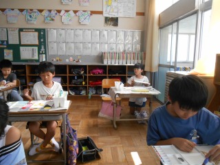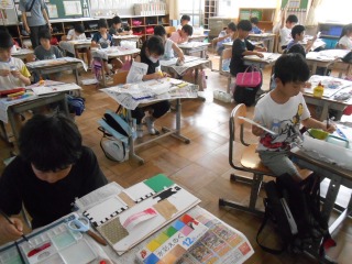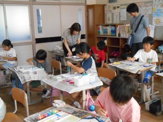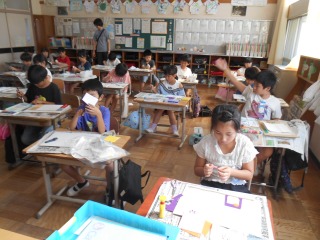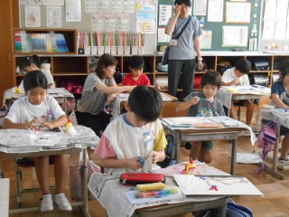 でこぼこ、ざらざらした素材に絵の具で色を塗り、画用紙に貼りつけていました。素材のよさを生かした、素晴らしい作品ができそうです。