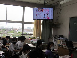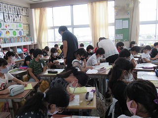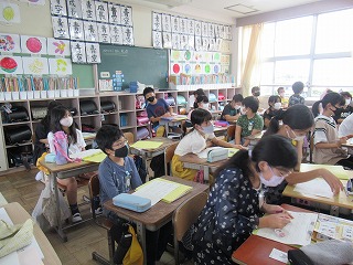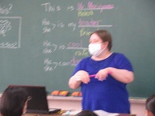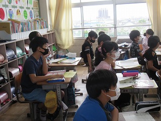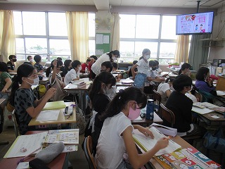5年1組では、外国語の授業が行われていました。いとこや兄弟姉妹など、その人の紹介の文を作っているところでした。