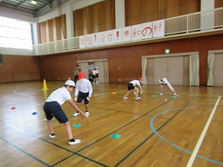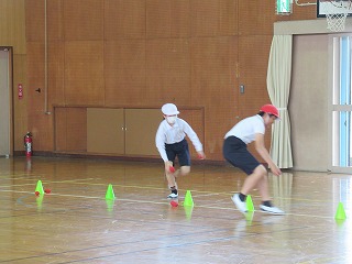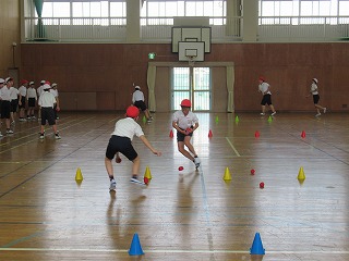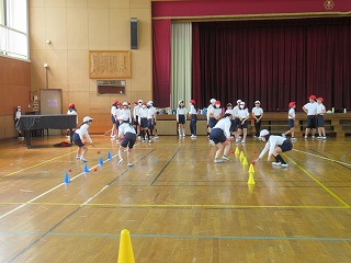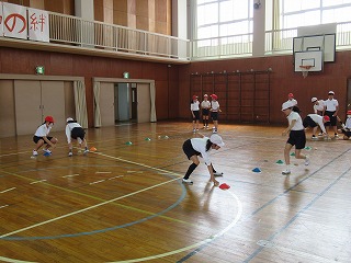 6年生は体育の時間でした。2人組で玉をもち、相手が置いたところに自分を玉を置いて、すばやく回収する動きを行っていました。反復横とびにつながる動きですが、上達できたかな?