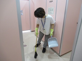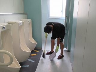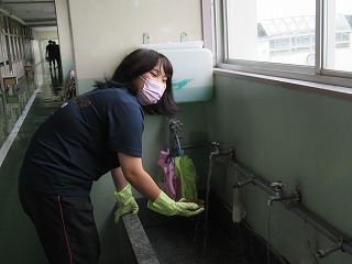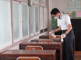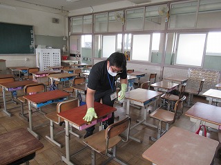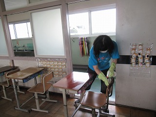 子どもたちが帰ったあと、先生方が各教室の机・いすを消毒しています。また、トイレと流しの掃除は、今のところ子どもたちにさせられないので、先生方が行っています。