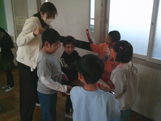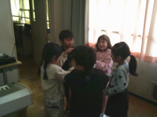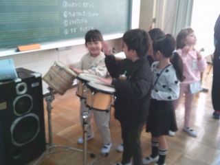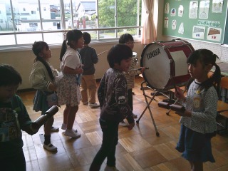 いろんな打楽器を演奏していました。音楽室の中は、大きな音でいっぱい。楽しそうにたたいていました。
