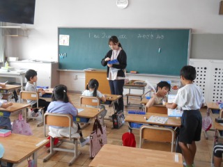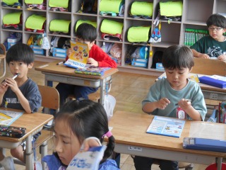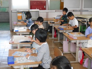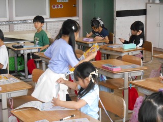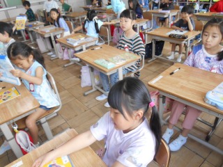 計算ドリルが配られました。油性ペンを使い、名前をそれぞれ書いていました。