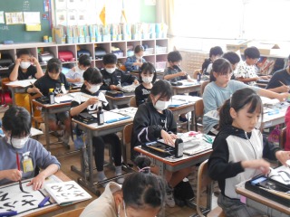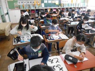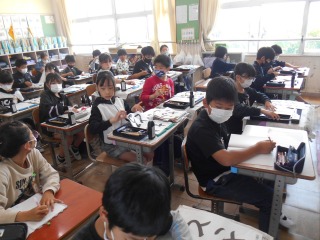 「ふるさと」を書いています。始筆の画につなげ、字形を整える」を目当てにがんばりました。