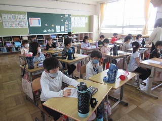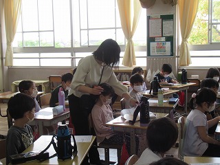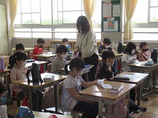 2年1組が、朝学習を行っていました。一人一人先生が、プリントに丸付けをして回っていました。