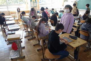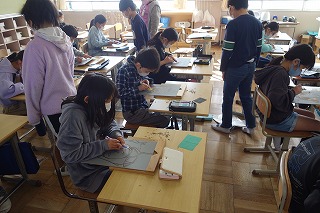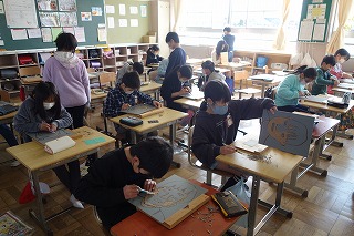4年1組の図画工作は、版画の制作に取り組みました。お互いにアドバイスをし合いながら制作を進めました。