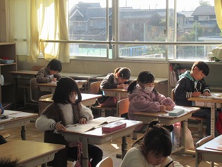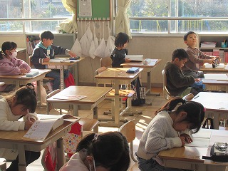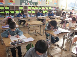 1年1組は国語の時間でした。漢字のドリルをよく見て、ノートに書き映していました。