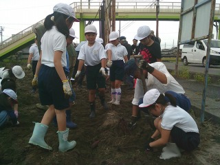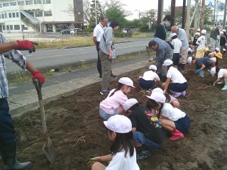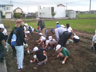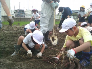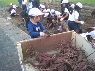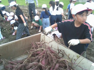 今日の2~3時間目は、低学年がいもほりを行います。2時間目は、まず2年生。軍手をどろどろにしながら、地元農業クラブの皆さんに手伝っていただきながらたくさんのサツマイモを掘って大喜びでした。