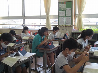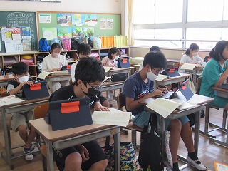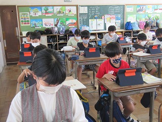 6年1組では、国語の授業が行われていました。タブレットを使い、自分の考えを理由を含めまとめていました。