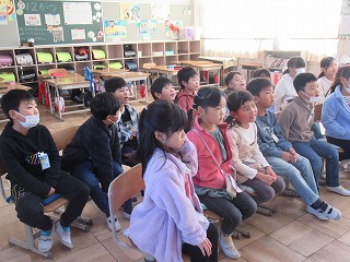 1年2組の児童が、読み聞かせを行ってもらうところでした。みんなわくわくした表情が見られます。
