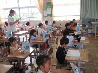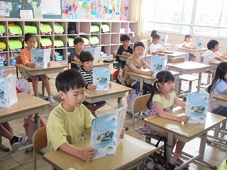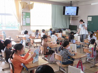 1年2組は国語の時間でした。教科書にある五十音の文章をみんなで音読していました。