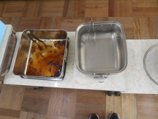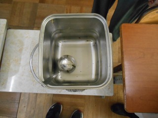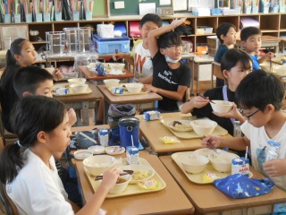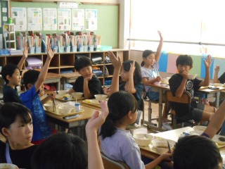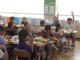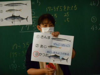 栄養教諭の先生から、今日の献立のカツオについてのお話でした。イラストを見ながら、どれがカツオかクイズを出されていました。また、カツオのしま模様は生きている間は出ていないことも知ることができました。しかも食缶を覗くと、空っぽでした。