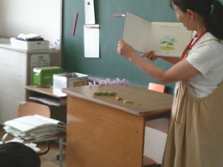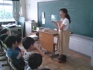 そらまめくんの絵本でした。本物のそらまめを持ってきていただき、子どもたちの目をキラキラさせて、絵本を聞いていました。