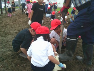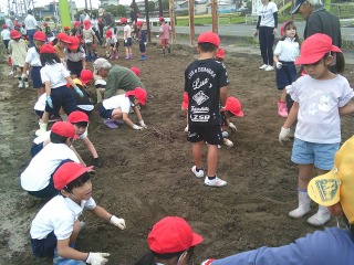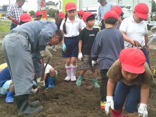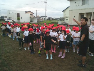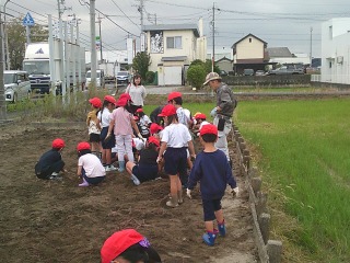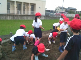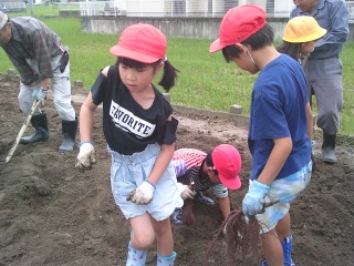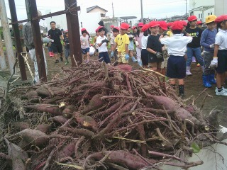 1年生は畑の南側を掘りました。サツマイモがたくさん取れ、満足そうに学校へ戻っていきました。来年2年生になったら、いもの苗を植える作業もすることとなります。