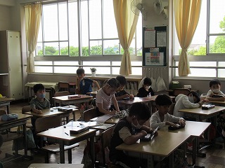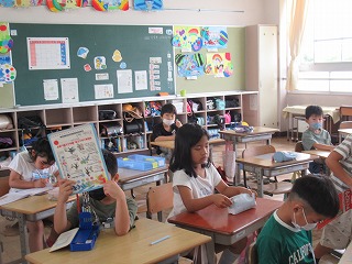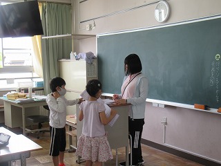2年1組では、朝の時間、漢字ドリルに取り組んでいました。できたら、先生に見てもらいます。上手に書けたかな?