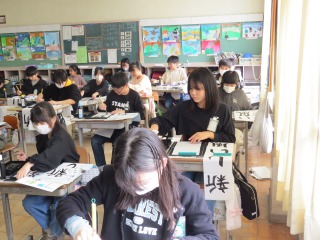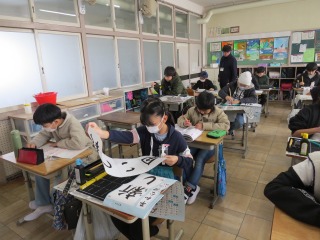 2組も長半紙に「新しい風」を描きました。いつもの半紙とは違い幅が狭いため、「新」と「風」のバランスに苦戦していました。