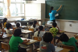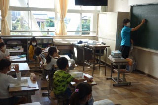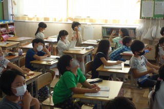 2年2組の算数は、かけ算の学習でした。かけ算を式に書く学習に取り組みました。