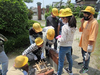 5年生が、野外活動に向けて、飯ごう炊飯実習を行いました。みんなで協力して、おいしいご飯を炊いてくださいね。