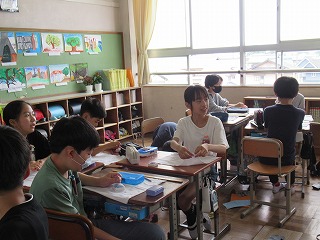 6年2組では、家庭科の授業が行われていました。裁縫の時間です。グループで話し合いをしていました。