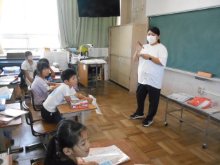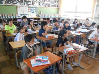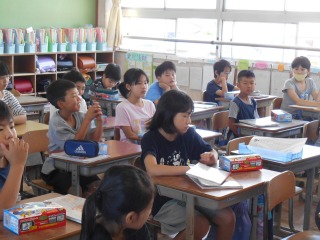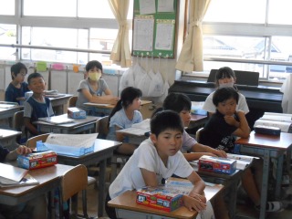 風を受けて走る車を組み立てます。先生の説明の後、工作に入ります。