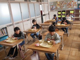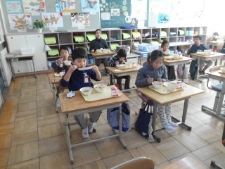 「もぐもぐタイム」の最中でした。給食の時間が残り少なくなると、班ではなく、前向きで食べることがあります。時間まで、食べることに集中します。