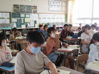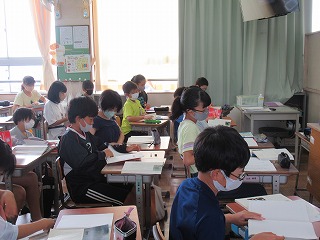 6年2組では、国語の授業が行われていました。自分の意見を書きこむためにノートに円を描くところでした。たくさん意見を書いてくださいね。