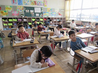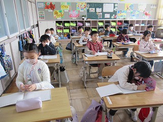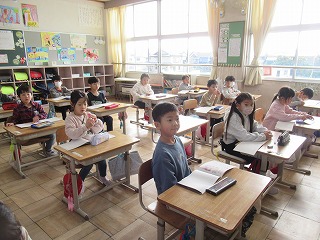1年2組では、算数の授業が行われていました。子どもたちは、しっかりお話を聞いていました。