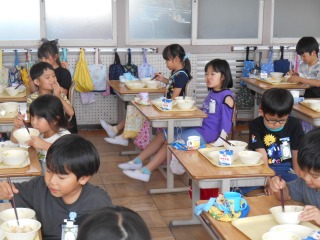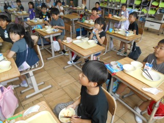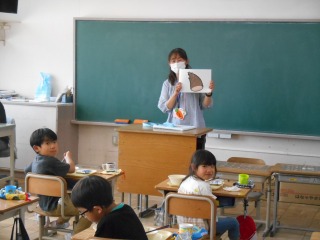 給食の時間、栄養教諭の先生による給食の説明がありました。今日の食材の「たけのこ」や「にんじん」などの説明をしていただきました。