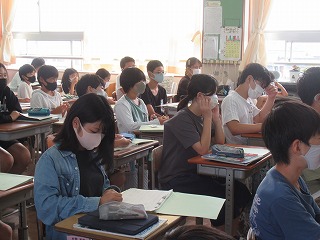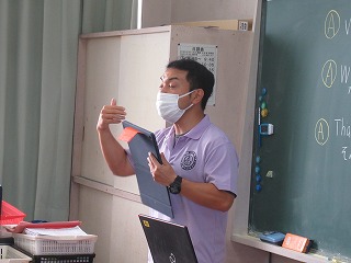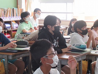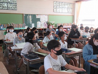 6年1組では、外国語の時間、タブレットを使い、会話を録画する授業の説明を聞いているところでした。上手に会話が成立するかな?楽しみですね。