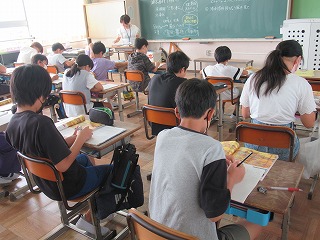 6年1組は社会の時間でした。習っている単元を、5分で説明するとしたら、どんな風に説明するといいかを考えて、ノートにまとめていました。