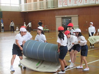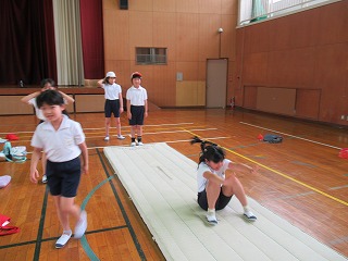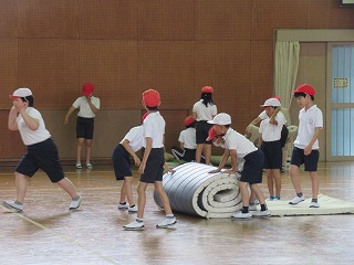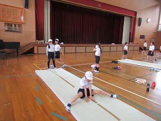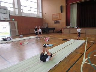 4年生は体育の時間でした。マットの準備から始まり、自分で考えた技の構成を練習していました。安全面に気を付けて、上手にできるように頑張ってくださいね。