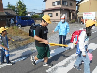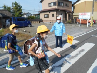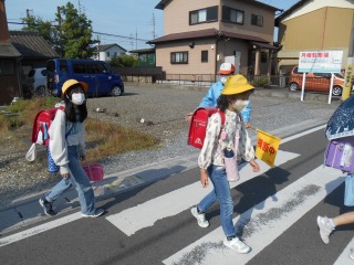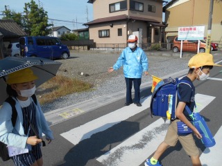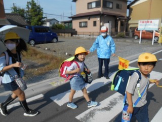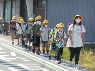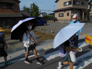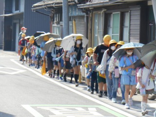暑い日です。日傘を差す子も多く、暑さ対策をして登校しています。