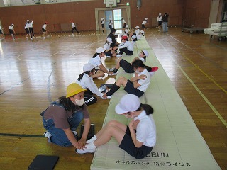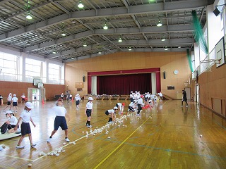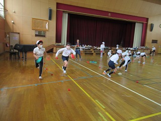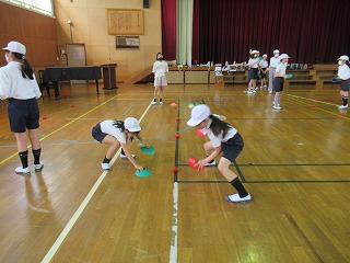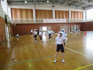 5年生は体育の時間でした。ボールを投げたり、体を起こしたり、すばやく動いたりと、器具を使いながら楽しそうに体を動かしていました。