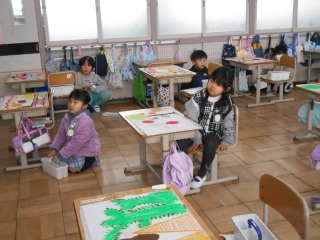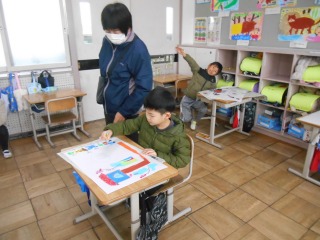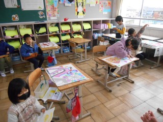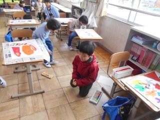 くれよんと絵具を組み合わせて作品を仕上げます。パレットの使い方について、確認しているところでした。