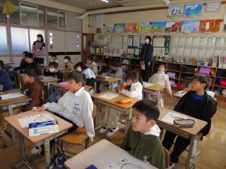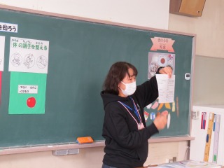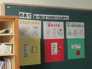 栄養教諭の先生による、栄養バランスについての授業を行いました。エネルギーになる、体をつくる、体の調子を整えるの3つの役割を果たす食べ物は何か、学習していました。