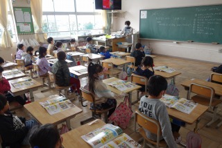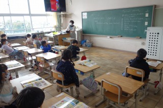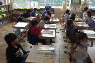 1年2組の図工は、「おはなしから うまれたよ」の学習でした。まず、先生から「アパートのひとたち」のお話を、みんなで聞きました。