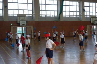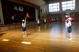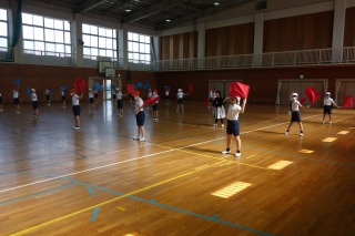 4年生の体育は、体育館でミワリンピック表現の練習でした。旗を使って、きびきびとおどっていました。