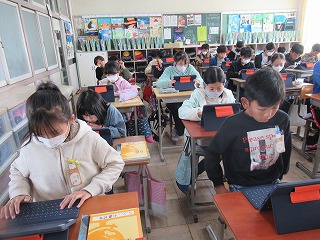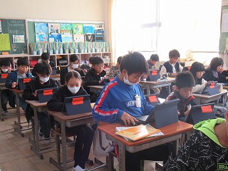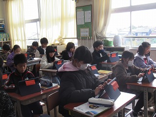 5年2組では、社会の時間、タブレットを使いまとめをしていました。